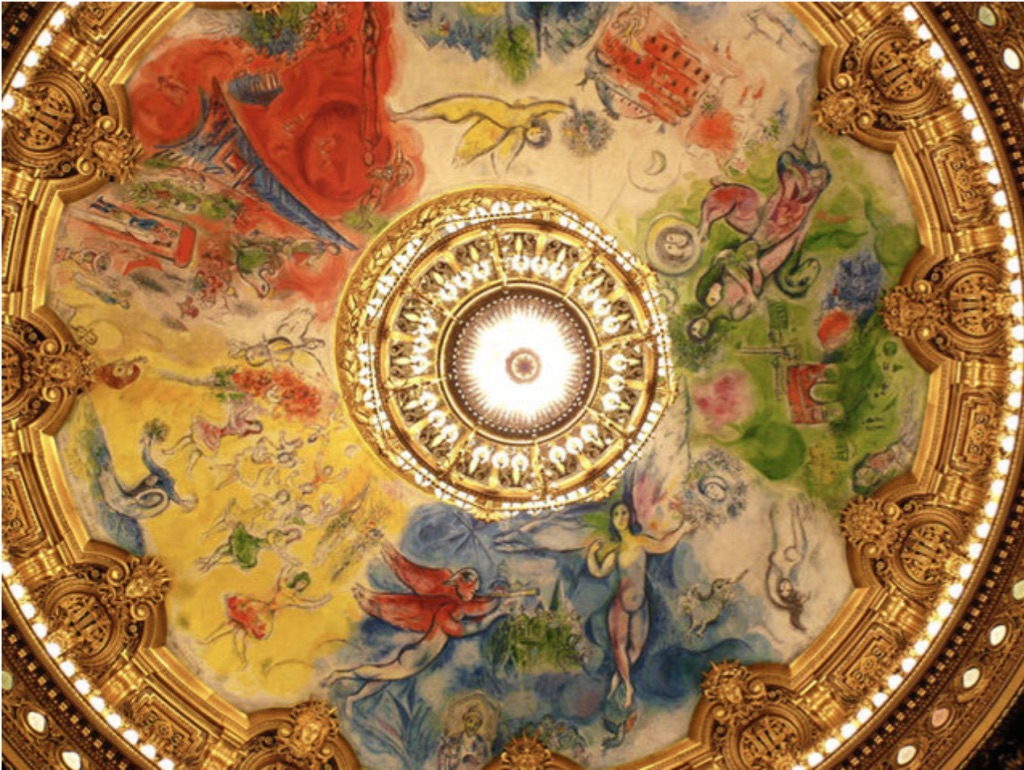 É como se desde a fachada, o público que adentra este espaço fosse sendo conduzido para o mundo das artes e da representação, reconhecendo a função e o uso de cada um dos diferentes espaços internos. Aos poucos, vamos sendo seduzidos, pelo uso de ouro e das cores, pelos mosaicos e diferentes tons de mármores. O percurso se faz de ambientes minerais e quase sem cores para a policromia da grande escadaria que nos leva à sala de espetáculo, ápice de todo teatro. O teto da sala, realizado por Marc Chagal anos 1960, nos põe em movimento onírico com diferentes operas e seus autores. Em um movimento ascendente, como o crescendo da música clássica, deixamos o mundo profano para adentramos ao mundo sagrado da arte protegido por Apolo, que se encontra representado no topo do edifício segurando sua lira dourada.