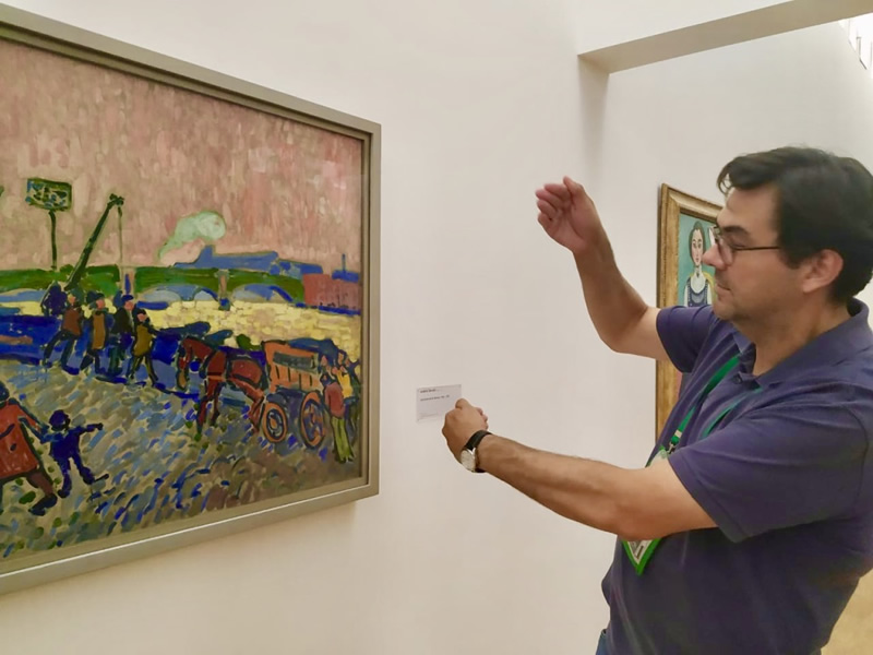 Durante nossas visitas guiadas, destinadas às crianças, famílias e grupos de adultos, vamos explorar obras de artistas de diferentes nacionalidades produzidas entre 1905 e 1965. Descobriremos o colorido intenso de pintores do fauvismo como Matisse e Derain, a representação da natureza e do humano através do uso de formas geométricas pelo cubismo de Picasso e Braque. Os caminhos de criação vão se multiplicando com as obras coloridas e sinfônicas de Kandinsky, com o ritmo e a vibração das cores e formas nas pinturas de Mondrian e Klee. A fantasia e o inconsciente invadem a realidade com os surrealistas, como Dalí, e o sonho e o onírico fazem parte do universo de Chagall e Miró. Da abstração gestual e da action painting de Pollock e de esculturas de Brancusi, Giacometti, Cesar, passamos ao chamado neo-realismo, quando os próprios objetos reais são utilizados concretamente para a sua própria representação enquanto obra de arte.